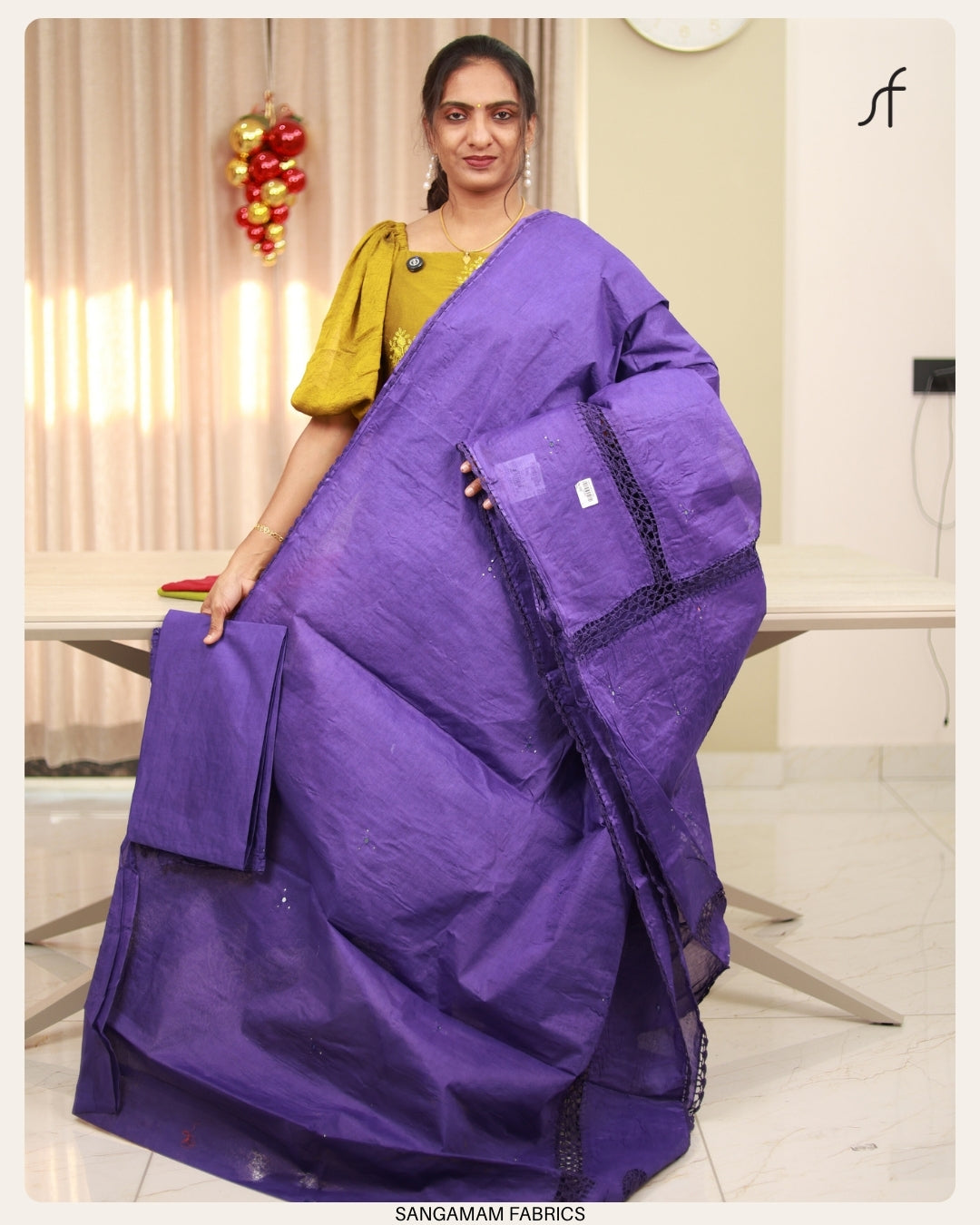 Elegant saree featuring delicate crochet lace detailing along the border and pallu, enhanced with subtle scattered motifs across the body. Lightweight and graceful, perfect for refined festive wear and special occasions